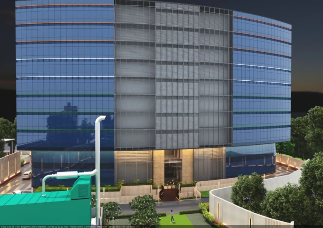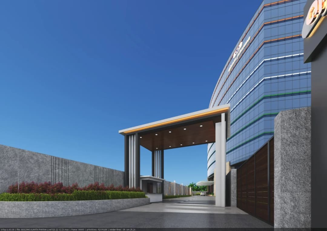 The concept is centered around corporate identity and monumental entrance design. The architecture blends clean modern lines with bold geometries, creating a strong visual language that represents stability and growth. The entrance gateway acts as a signature element, enhancing brand presence while ensuring functional access and security.