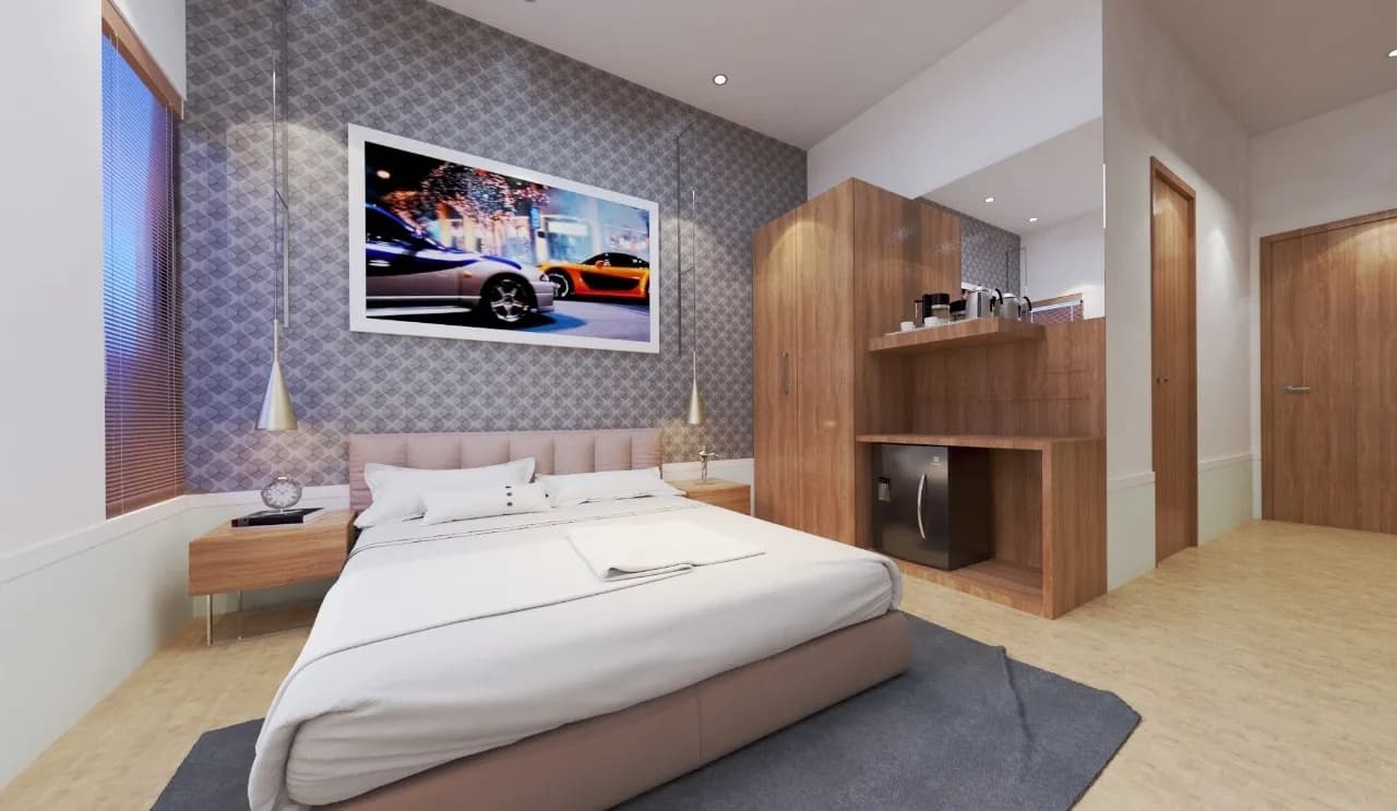A contemporary hospitality interior designed to create a warm, comfortable, and elegant guest experience through soft lighting and refined finishes.