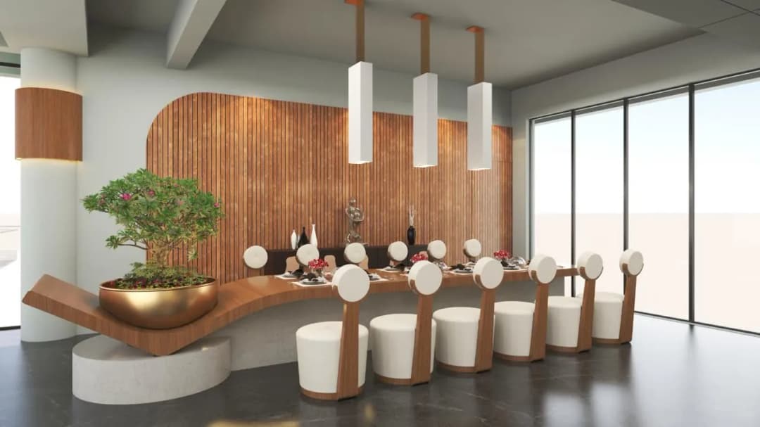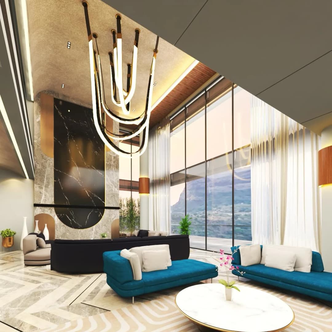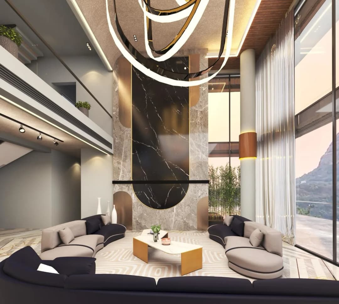 The interiors follow a contemporary design language with warm finishes, large glazed openings, and carefully curated furniture layouts.