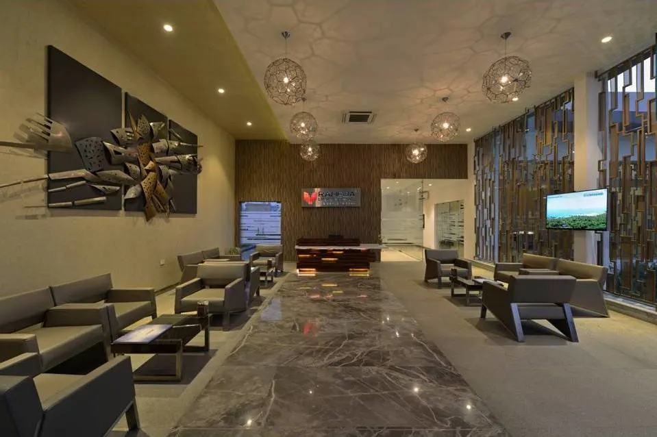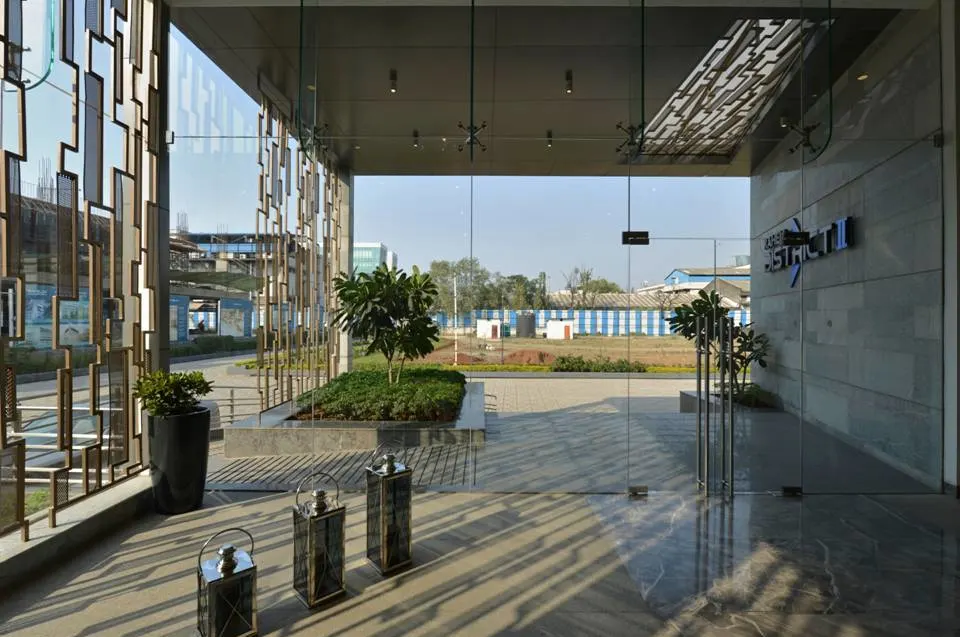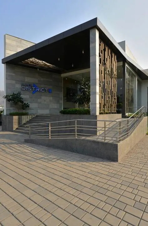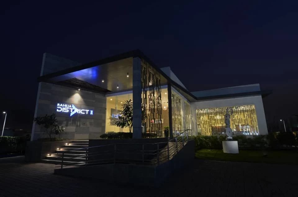 The arrival pavilion at Raheja District II serves as the welcoming landmark for visitors entering the campus. Designed with clean architectural lines, expansive glazing, and refined material finishes, the building reflects the professional identity of the business district.